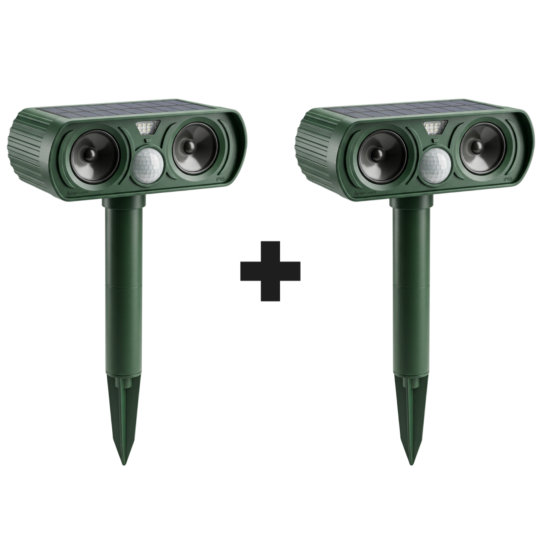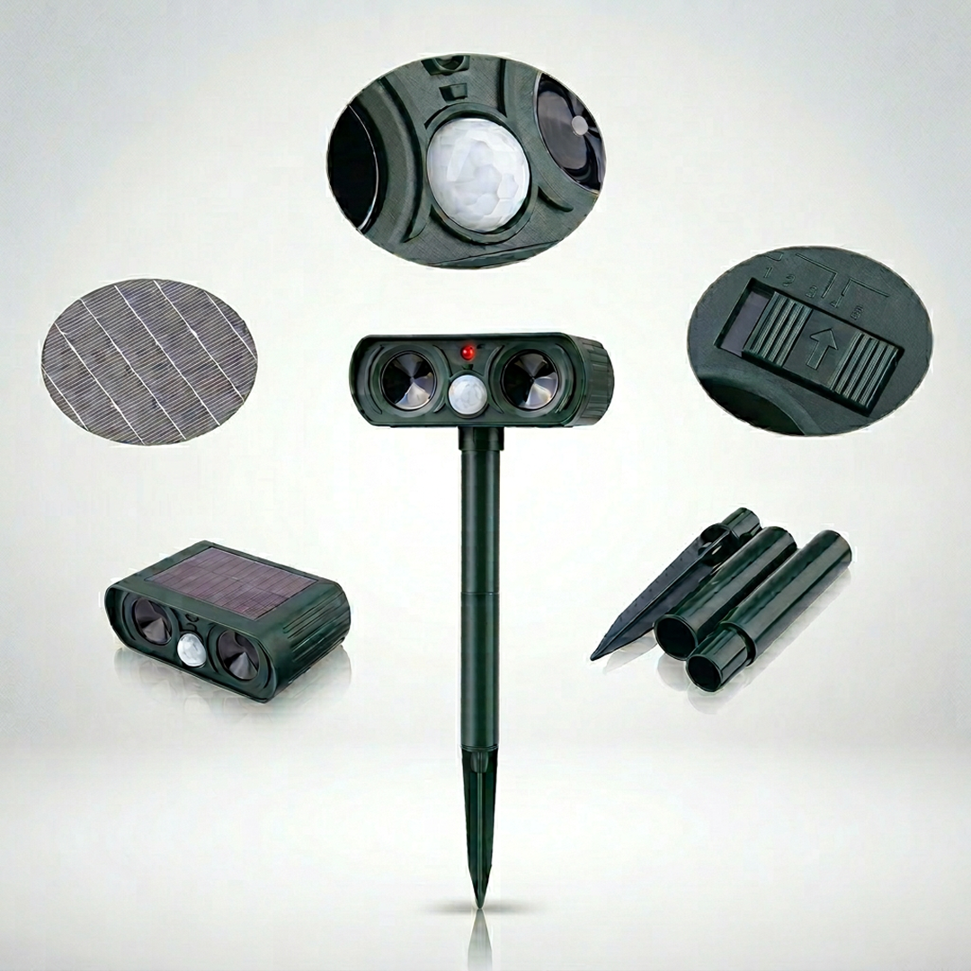 Repelent ultrasonic solar pentru alungarea animalelor si daunatorilor din curte, gradina sau livada. Echipat cu detectare infrarosu, panou solar si baterie reincarcabila, functioneaza ecologic fara substante toxice, fiind ideal pentru utilizare permanenta in exterior.