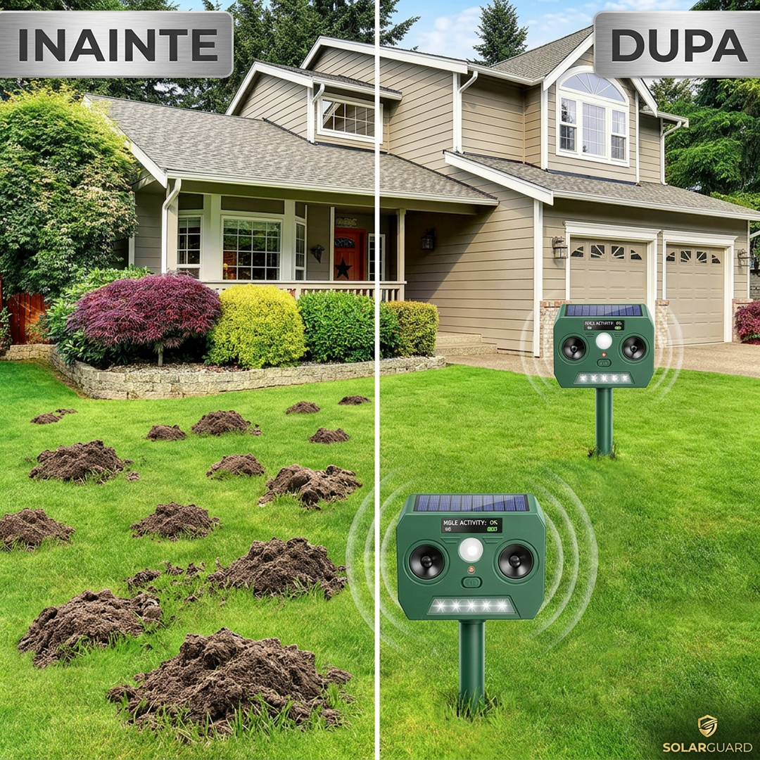 Aparat cu ultrasunete pentru alungarea animalelor salbatice si domestice nedorite, echipat cu panou solar, acumulator reincarcabil, 2 moduri de functionare si 5 LED-uri stroboscopice. Solutie eficienta si ecologica pentru protectia gradinii, curtii sau fermei, fara a rani animalele.