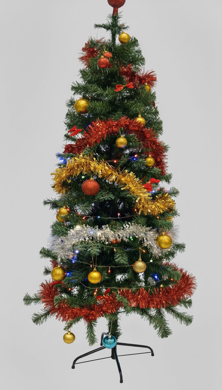 Brad Artificial 1.80m cu Set Impodobit 24 Globuri, 4 Beteala, Instalatie 100 LED, Suport Metalic