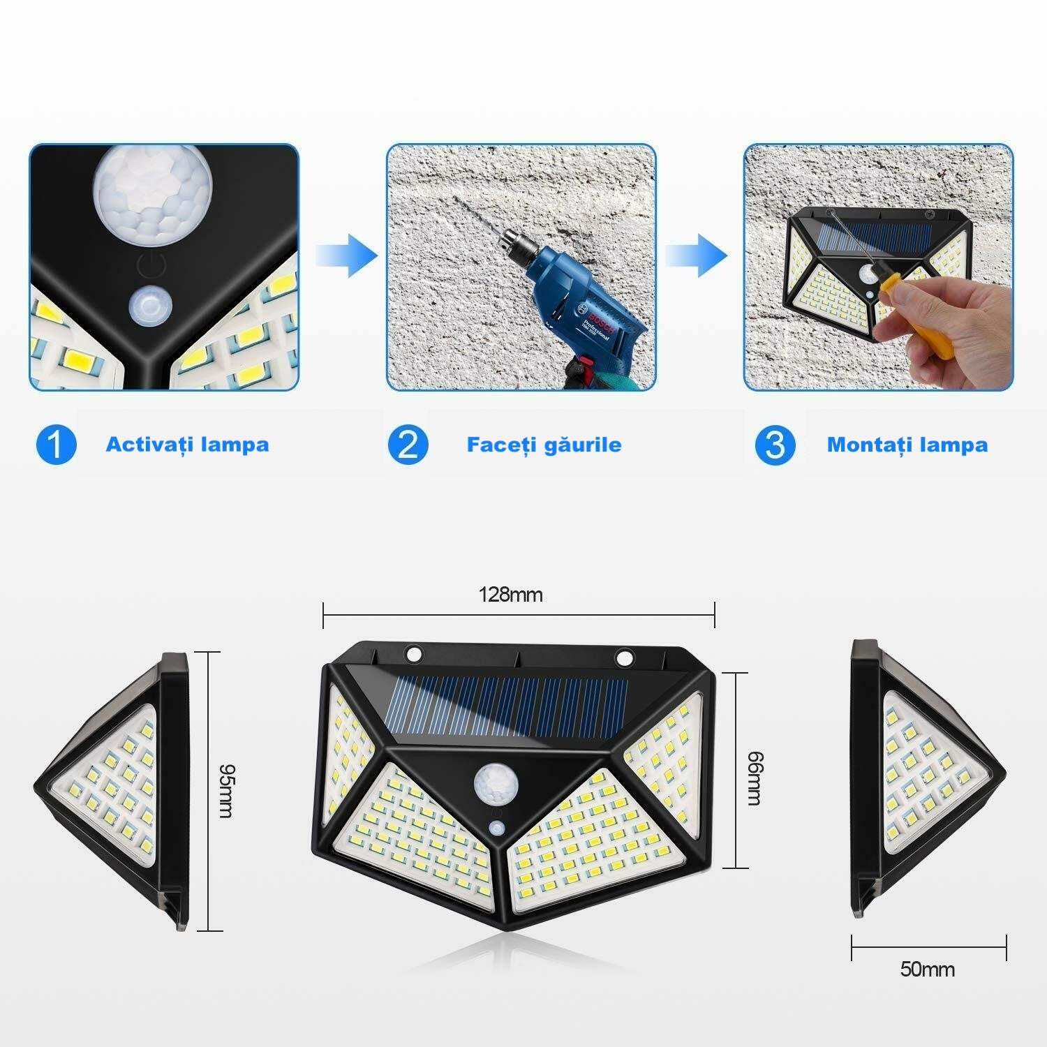 Adaugă siguranță și stil curții, grădinii sau casei tale cu această lampă solară cu 100 de LED-uri! Puternică, rezistentă și complet autonomă, se încarcă ziua de la soare și luminează generos noaptea, fără cabluri, fără facturi și fără bătăi de cap.