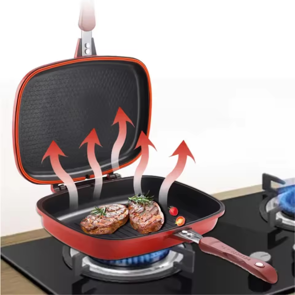 Tigaia dubla de 36 cm este ideala pentru gatitul uniform si rapid al alimentelor, fara a folosi ulei in exces. Realizata din aluminiu forjat cu interior antiaderent marmorat, asigura o preparare sanatoasa si curata. Inchiderea magnetica si garnitura de silicon mentin presiunea si aroma in interior, oferind rezultate perfecte la fiecare utilizare.