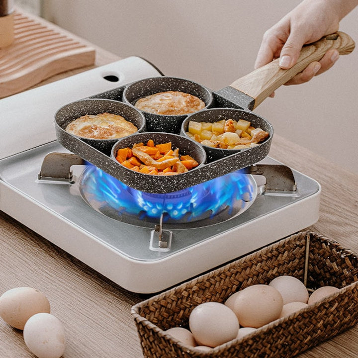 Gătește mai rapid și mai variat cu tigaia antiaderentă cu 4 compartimente! Ideală pentru familii, îți permite să prepari patru tipuri de mâncăruri simultan — fără ca aromele să se amestece. Perfectă pentru ouă, clătite, omlete, sandvișuri sau garnituri.